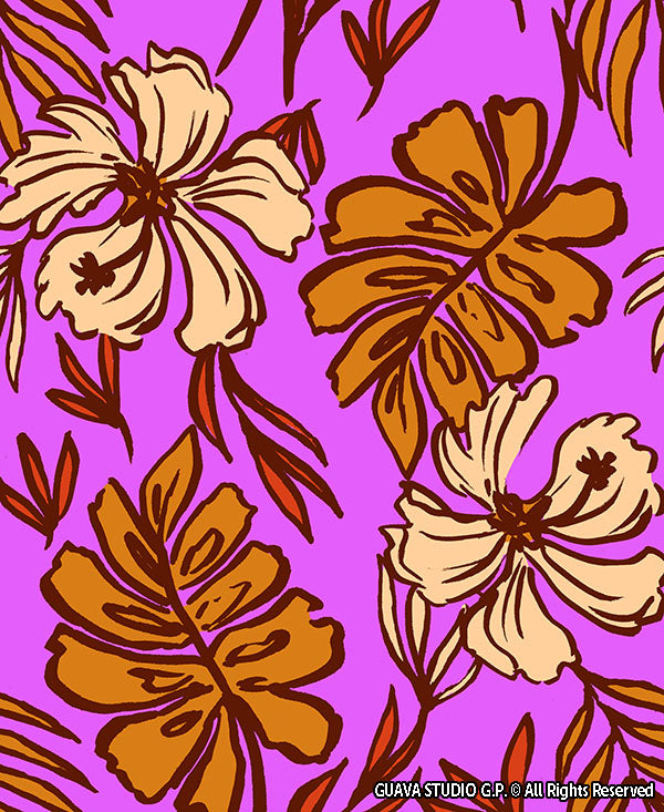 0841C- Purple, Mustard Yellow and Off White Tropical Foliage